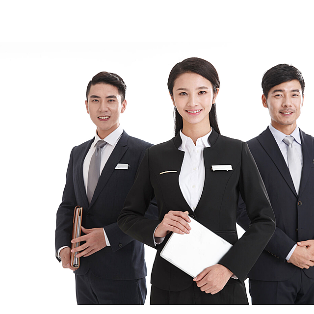 一个女生,正面,蓝色西服,粉白渐变背景详情